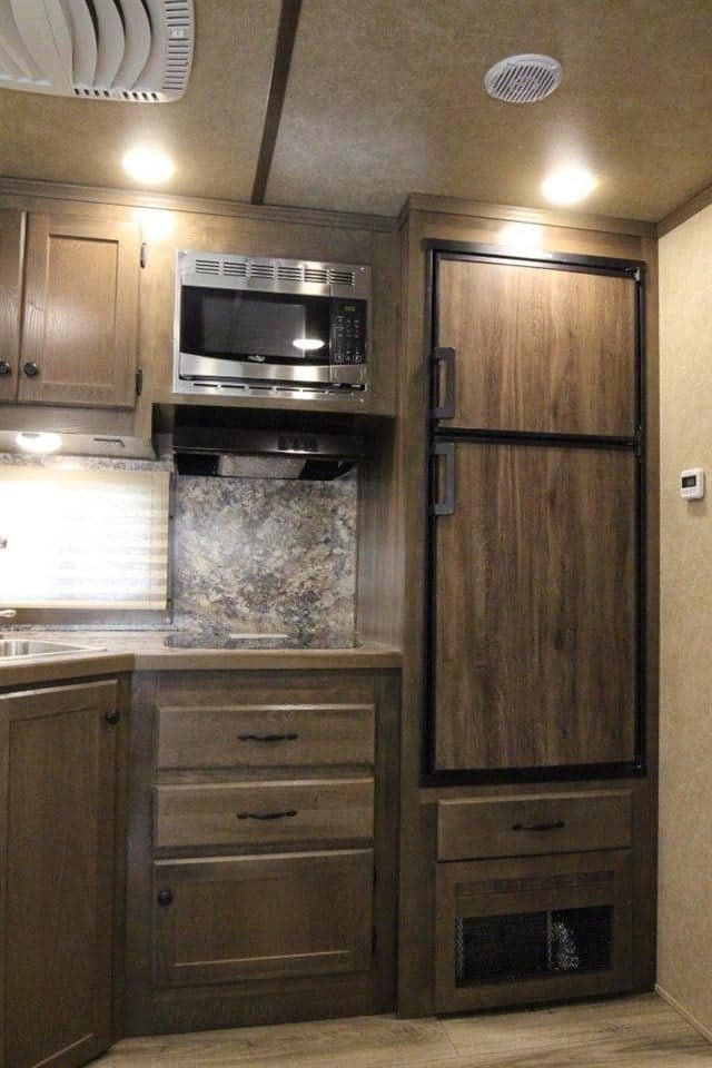 โ€ข The kitchen is also equipped with a two-burner stove top, microwave and sink.