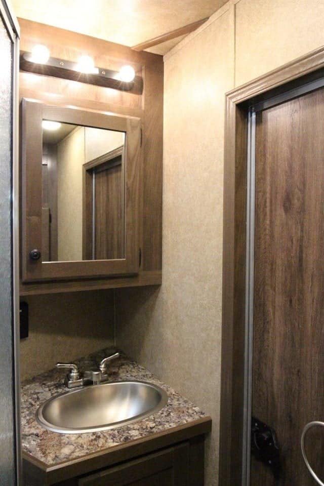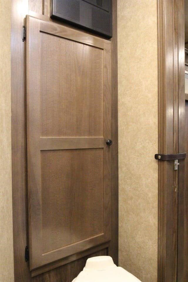 โ€ข The bathroom has a spacious shower, storage and a walk-through door to the mid tack.
